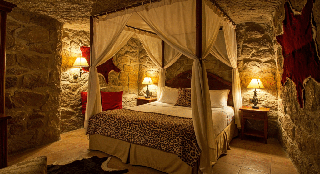 The resort has 360 cave-style rooms. Each room uses stone and wood. They feel cozy and adventurous. All rooms have air conditioning, TV, and WiFi. You can choose from four room types.